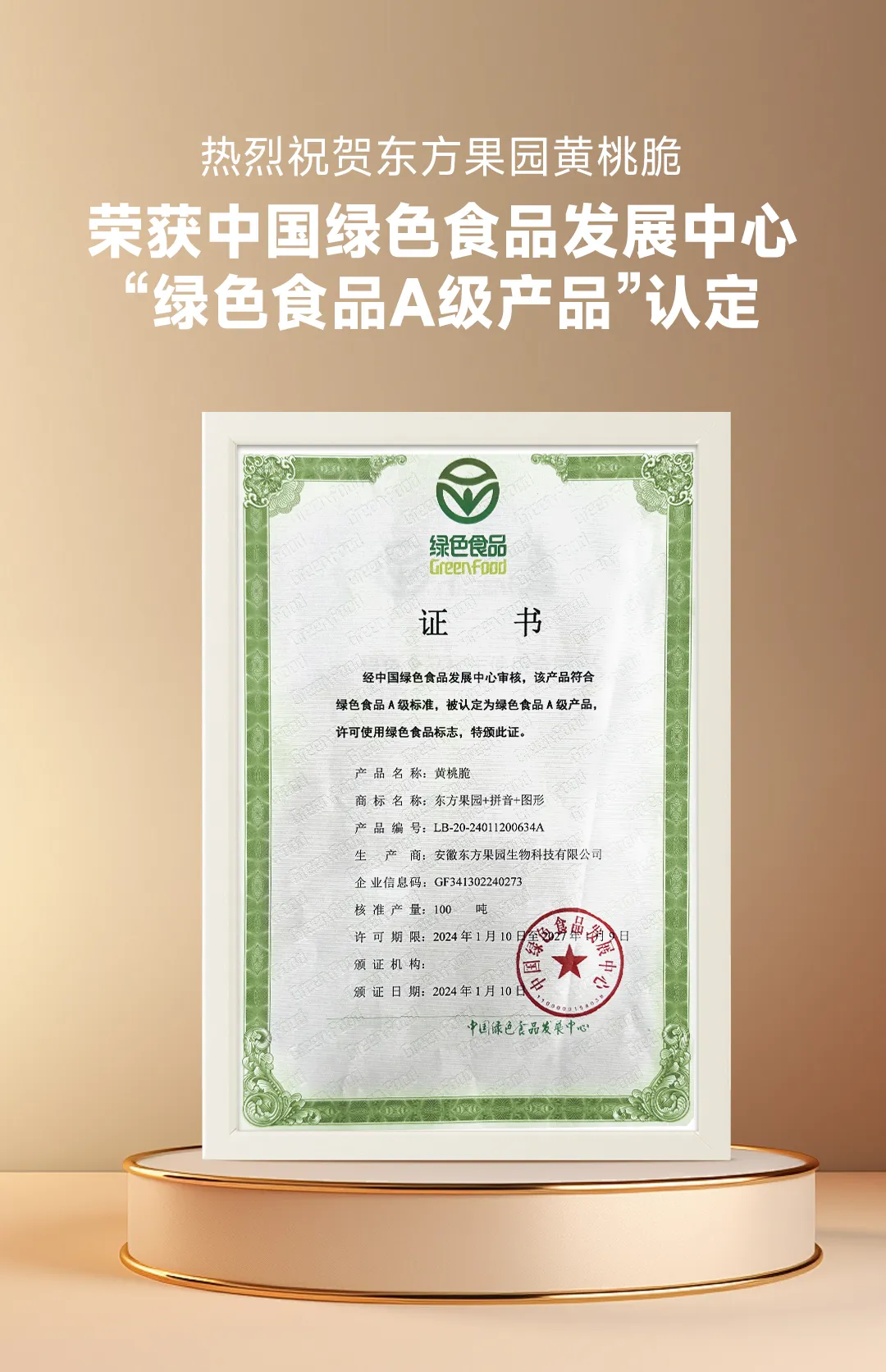 日前經(jīng)中國綠色食品發(fā)展中心審核,東方果園黃桃脆符合綠色食品A級標(biāo)準(zhǔn),被認(rèn)定為綠色食品A級產(chǎn)品許可使用綠色食品標(biāo)志。