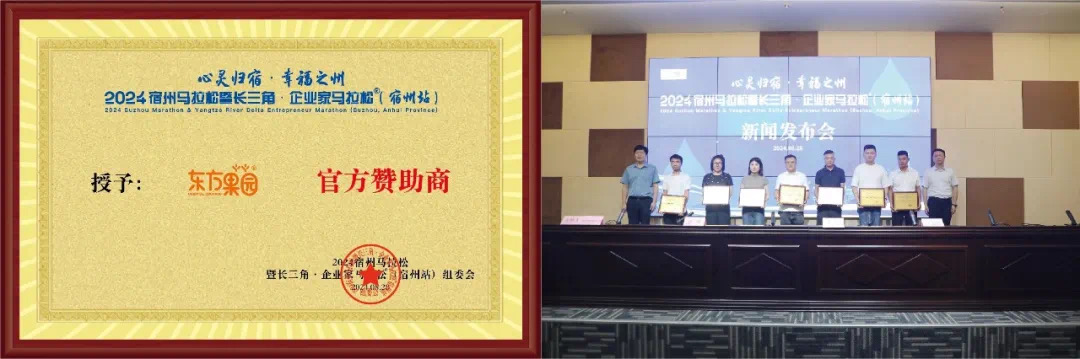 8月28日上午,2024宿州馬拉松暨長三角企業(yè)家馬拉松(宿州站)新聞發(fā)布會在宿州市規(guī)劃館一樓發(fā)布廳隆重召開。本次賽事不僅是一場體育競技的盛宴,更是促進(jìn)長三角地區(qū)體育、文化、旅游交流融合與經(jīng)濟(jì)合作的重要平臺。東方果園作為此次賽事官方贊助商全力支持宿州舉辦馬拉松賽事,為選手們加油喝彩!