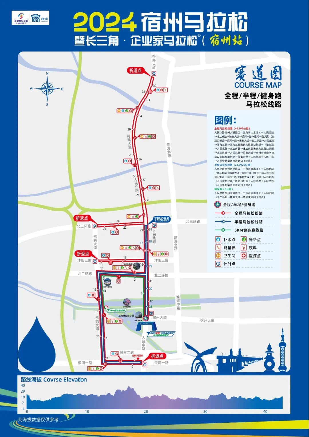 2024宿州馬拉松暨長三角企業(yè)家馬拉松將于2024年10月27日(星期日)上午7:30于宿州三角洲生態(tài)公園鳴槍開跑,賽事設(shè)置全程馬拉松(42.195km)3000人、半程馬拉松(21.0975km)7000人、健身跑(5km)5000人三個(gè)項(xiàng)目,總規(guī)模達(dá)15000人。該路線充分展現(xiàn)了宿州市的自然風(fēng)光與城市風(fēng)貌,途經(jīng)三角洲生態(tài)公園、宿州市體育館、美術(shù)館、銀河廣場等多個(gè)標(biāo)志性地點(diǎn),讓參賽者在奔跑中領(lǐng)略宿州之美。