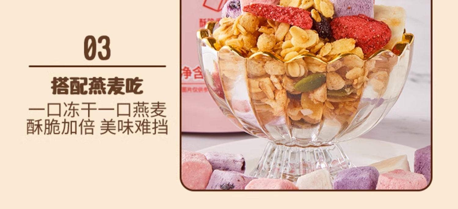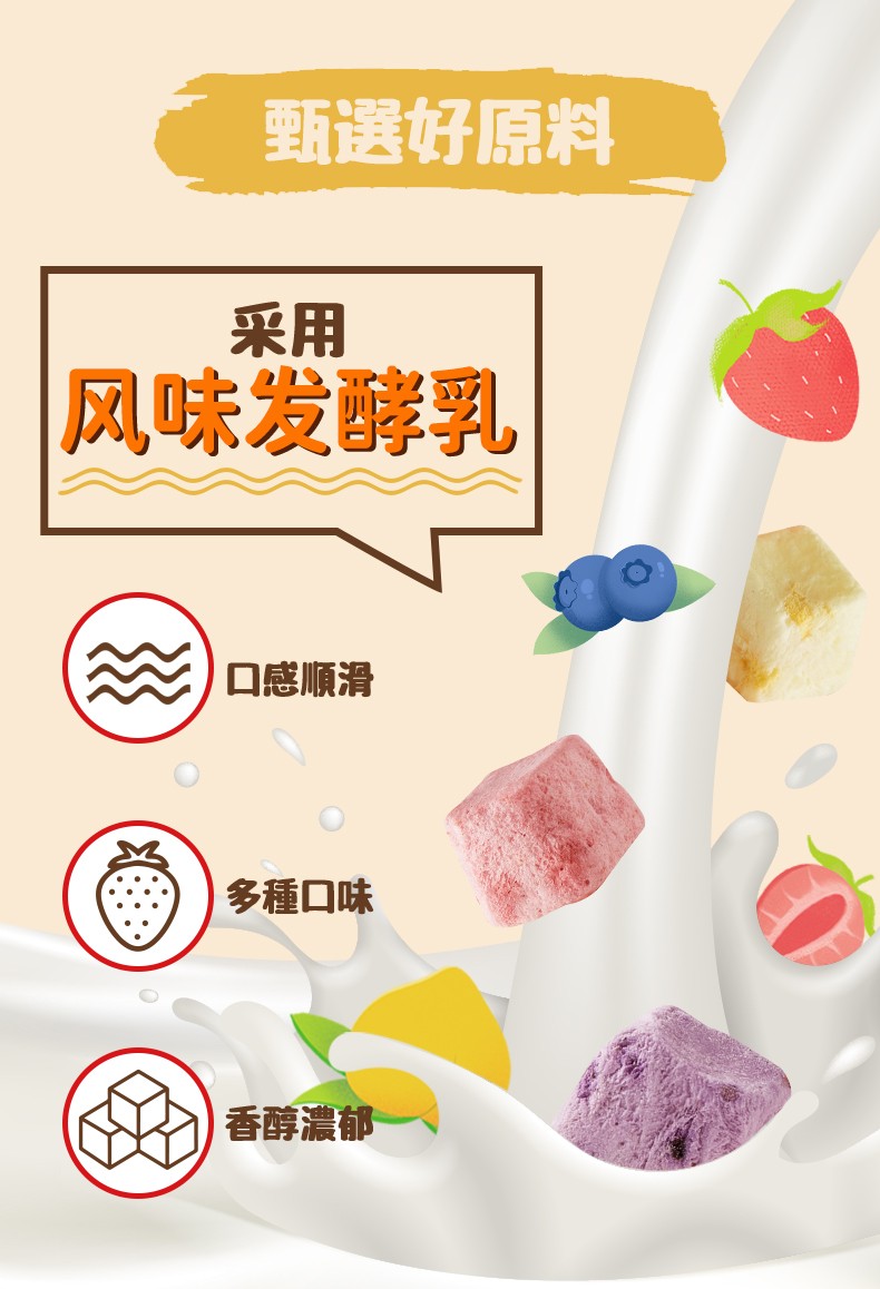 凍干酸奶塊,搭配牛奶更加美味。甄送好原料,采用風(fēng)味發(fā)酵乳,口感順滑,香醇濮郁。凍干黑科技,F(xiàn)D真空冷演干燥技布鎮(zhèn)住美味 -酸甜草莓味肆意彌漫!